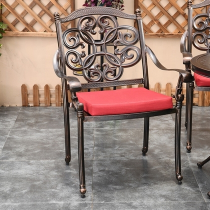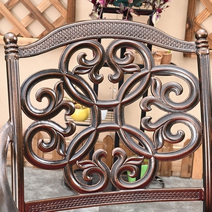 Обеденный комплект из литого алюминия состоит из стола и шести кресел с подлокотниками.