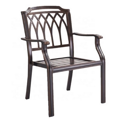 Обеденный комплект из литого алюминия состоит из стола и восьми кресел с подлокотниками.