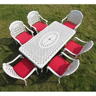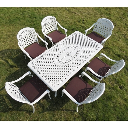 Обеденный комплект из литого алюминия состоит из стола и шести кресел с подлокотниками.
