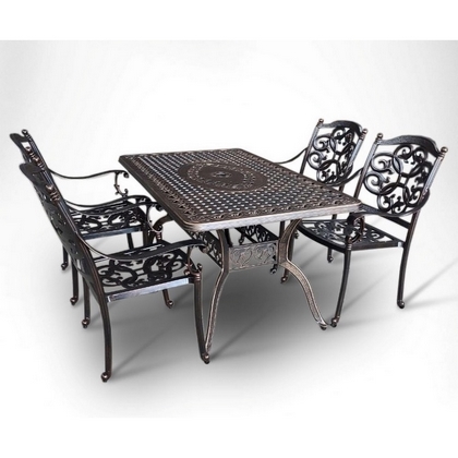 Обеденный комплект из литого алюминия состоит из стола и четырех кресел с подлокотниками.