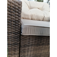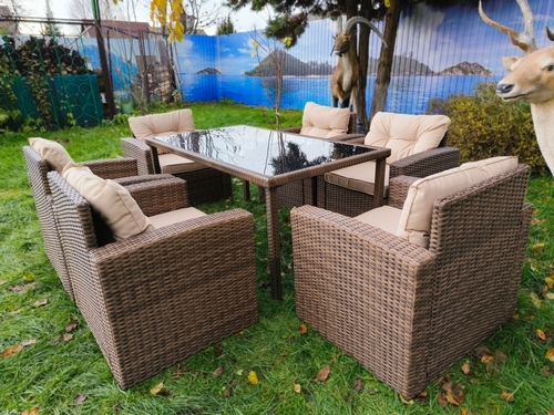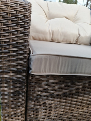 Комплект мебели из искусственного ротанга состоит из стола Милан и шести кресел Сантьяго с подушками на сиденье и спинку с водоотталкивающей обивкой.