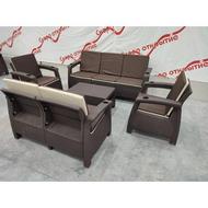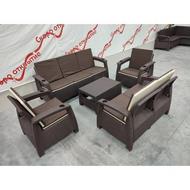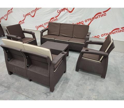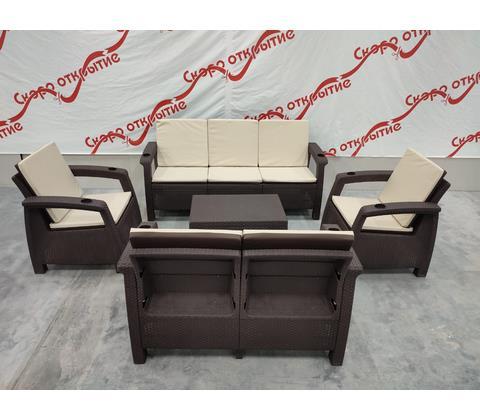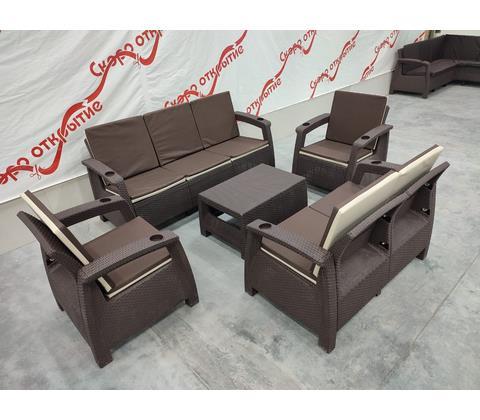 В комплект входит: стол, диван трёхместный, диван двухместный, кресло - 2 шт, подушки на сиденья и спинки.