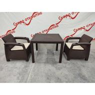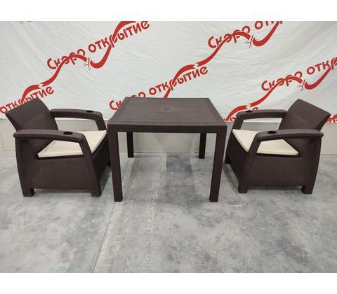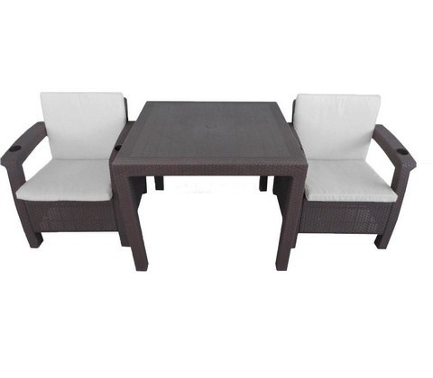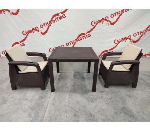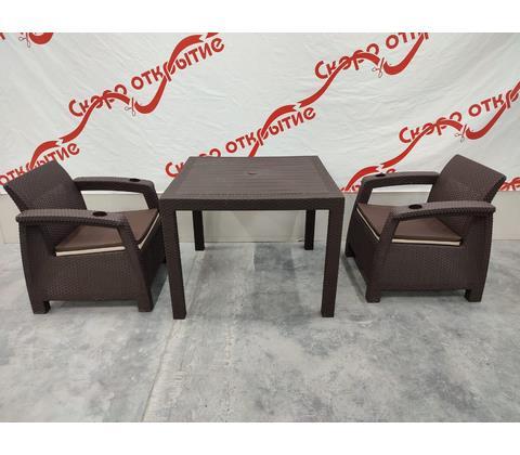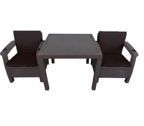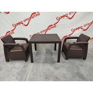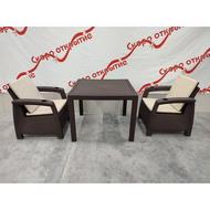 В комплект входит: кресло - 2 шт, стол, подушки на сидение и на спинку.
