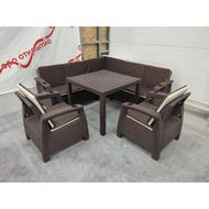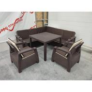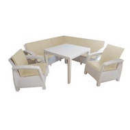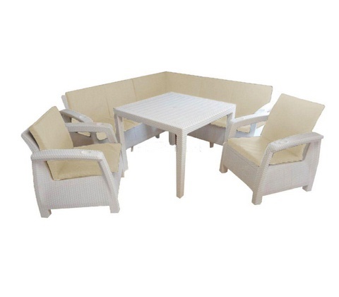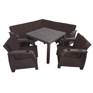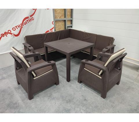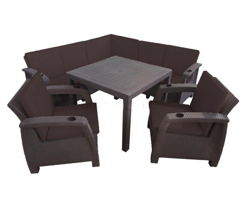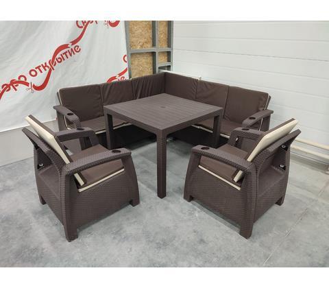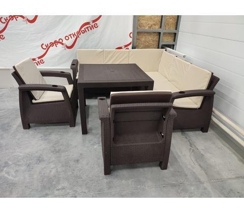 В комплект входит: кресло - 2 шт, стол, угловой диван, подушки на сидение и на спинку (бежевый/коричневый).