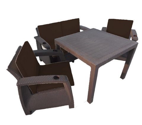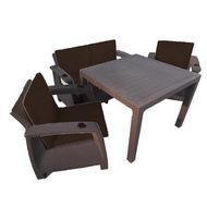 В комплект входит: кресло - 2 шт, стол, двухместный диван, подушки на сидение и на спинку (бежевый/коричневый).