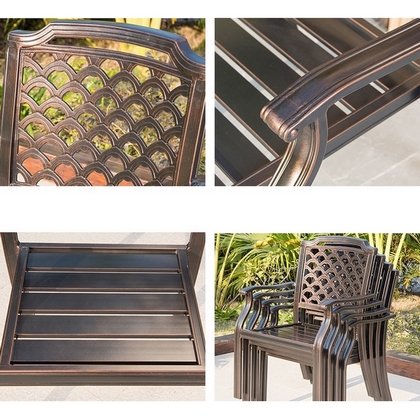 Обеденный комплект из литого алюминия состоит из стола и шести кресел с подлокотниками.