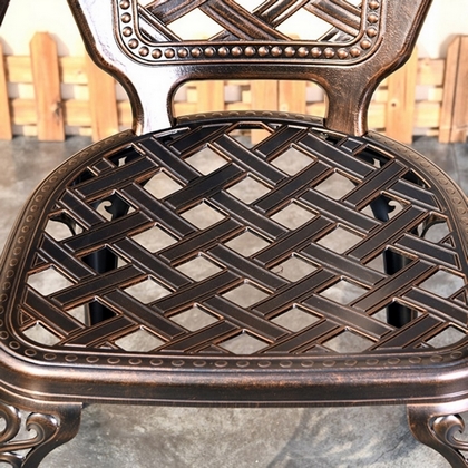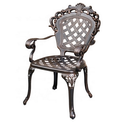 Обеденный комплект из литого алюминия состоит из стола и шести кресел с подлокотниками.