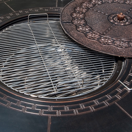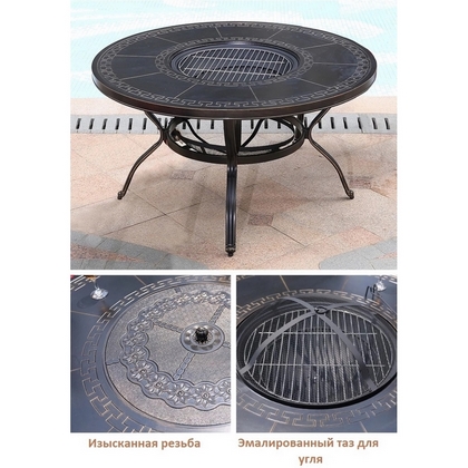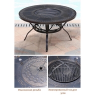 Широкий стол с круглой столешницей, декорированный орнаментом, и мангалом по центру.