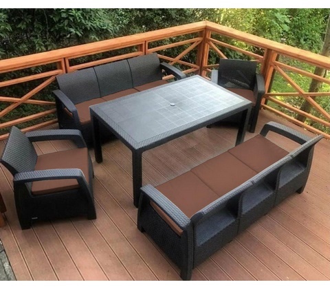 В комплект входит: стол, трёхместный диван - 2 шт, кресло - 2 шт, подушки на сиденья и спинки.