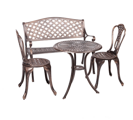 комплект состоит из круглого стола, скамейки и двух кресел,