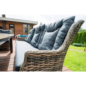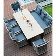 Материал изделия: нержавеющая сталь/поливуд (стол), искусственный ротанг/ткань olefine (кресло, диван).