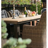 Цветовое исполнение: стол - коричневый (тик), кресло - коричневый (каркас) / темно-серый (подушки).