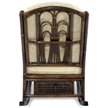 Материалы изделия: каркас - натуральный ротанг, полозья - массив дерева махагони, подушка - ткань шенилл с мягким наполнителем.
