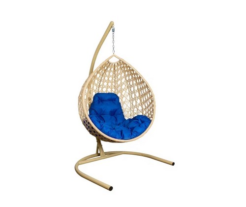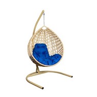 Подвесное кресло Капля Люкс с ротангом (бежевое с синей подушкой)