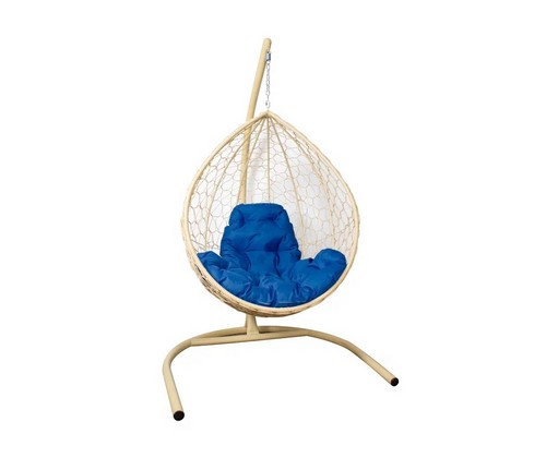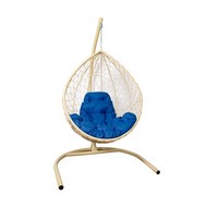 Подвесное кресло Кокон Капля с ротангом (бежевое с синей подушкой)
