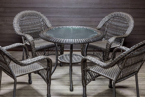 Материалы: Каркас - сталь, плетение - искусственный ротанг, столешница - закалённое рифлённое стекло.