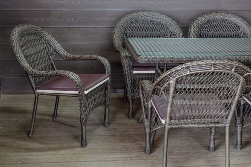 Материалы: Каркас - сталь, плетение - искусственный ротанг, столешница - стекло.