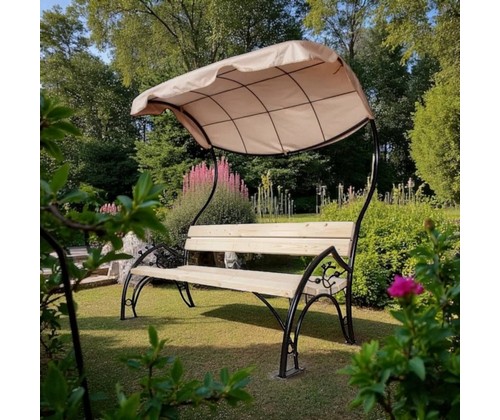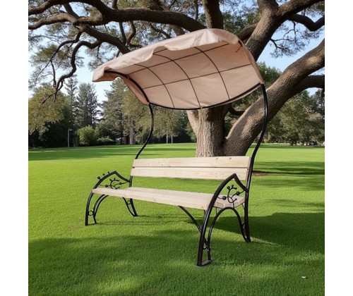 Деревянная скамейка с металлическим каркасом и тентом - идеальное решение для создания комфортной зоны отдыха на дачном участке или в саду.