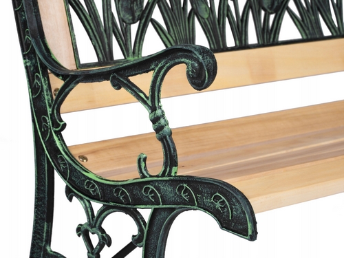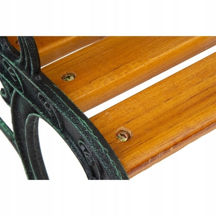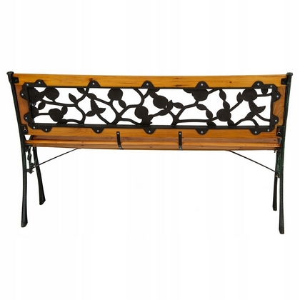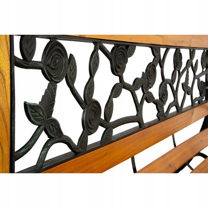 Прочная чугунная рама обеспечивает надежность и устойчивость, а натуральные деревянные ламели сиденья и спинки добавляют теплоты и комфорта.