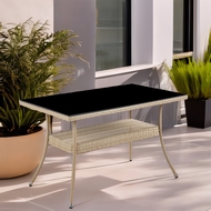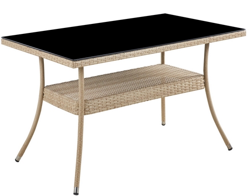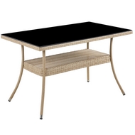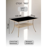 Особенности: Стол из искусственного ротанга станет отличным украшением сада или интерьера дома. Прочный и удобный. Есть полочка под столешницей, на которой можно разместить как предметы декора, так и в качестве подставки под горячее. Стекло столешницы тонировано. Устойчив к влаге, перепадам температуры, ультрафиолетовому излучению. Сохраняет свой внешний вид надолго. Устойчивый и прочный. Вес - 20 кг.