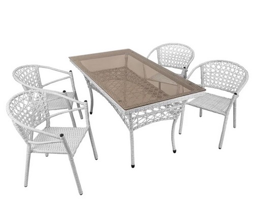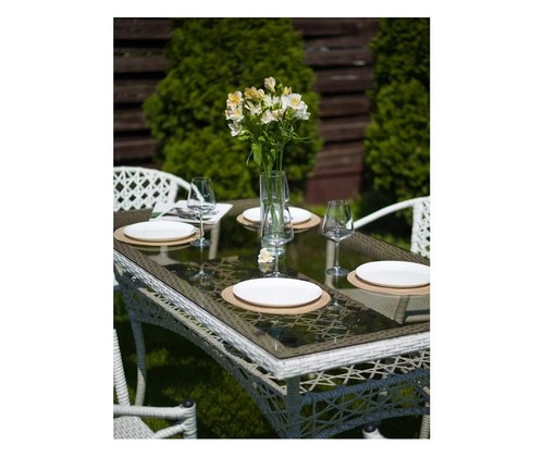 Искусное плетение из искусственного ротанга создает привлекательный визуальный эффект и добавляет столу легкости и элегантности.