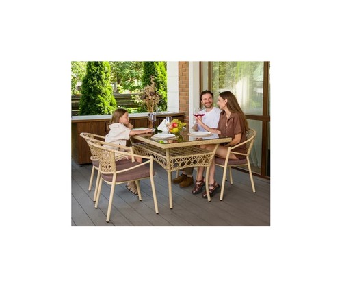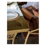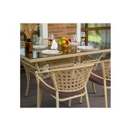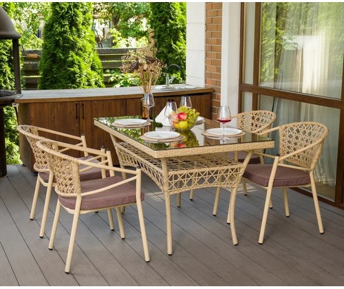 Искусное плетение из искусственного ротанга придает столу привлекательный внешний вид.