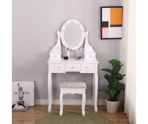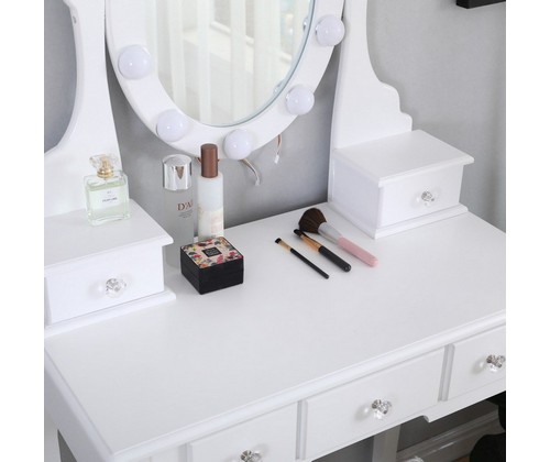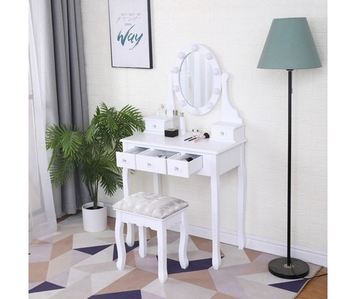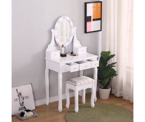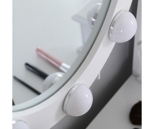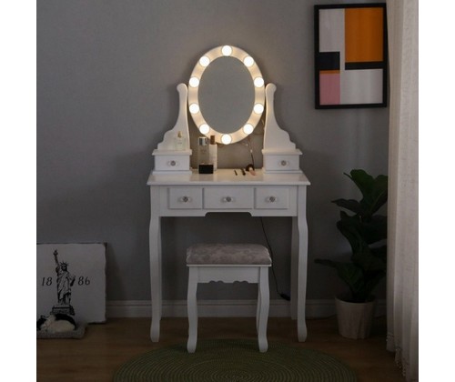 Туалетный столик S010 для спальни в классическом стиле с зеркалом с ламповой подсветкой, выдвижными ящиками и пуфом.