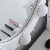 Лампы по периметру зеркала равномерно освещают лицо. Подсветка имеет три режима регулировки яркости (пульт проводной, лампочки в комплекте).