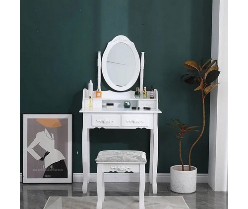 Туалетный столик S005 для спальни в классическом стиле с зеркалом, двумя выдвижными ящиками и пуфом.